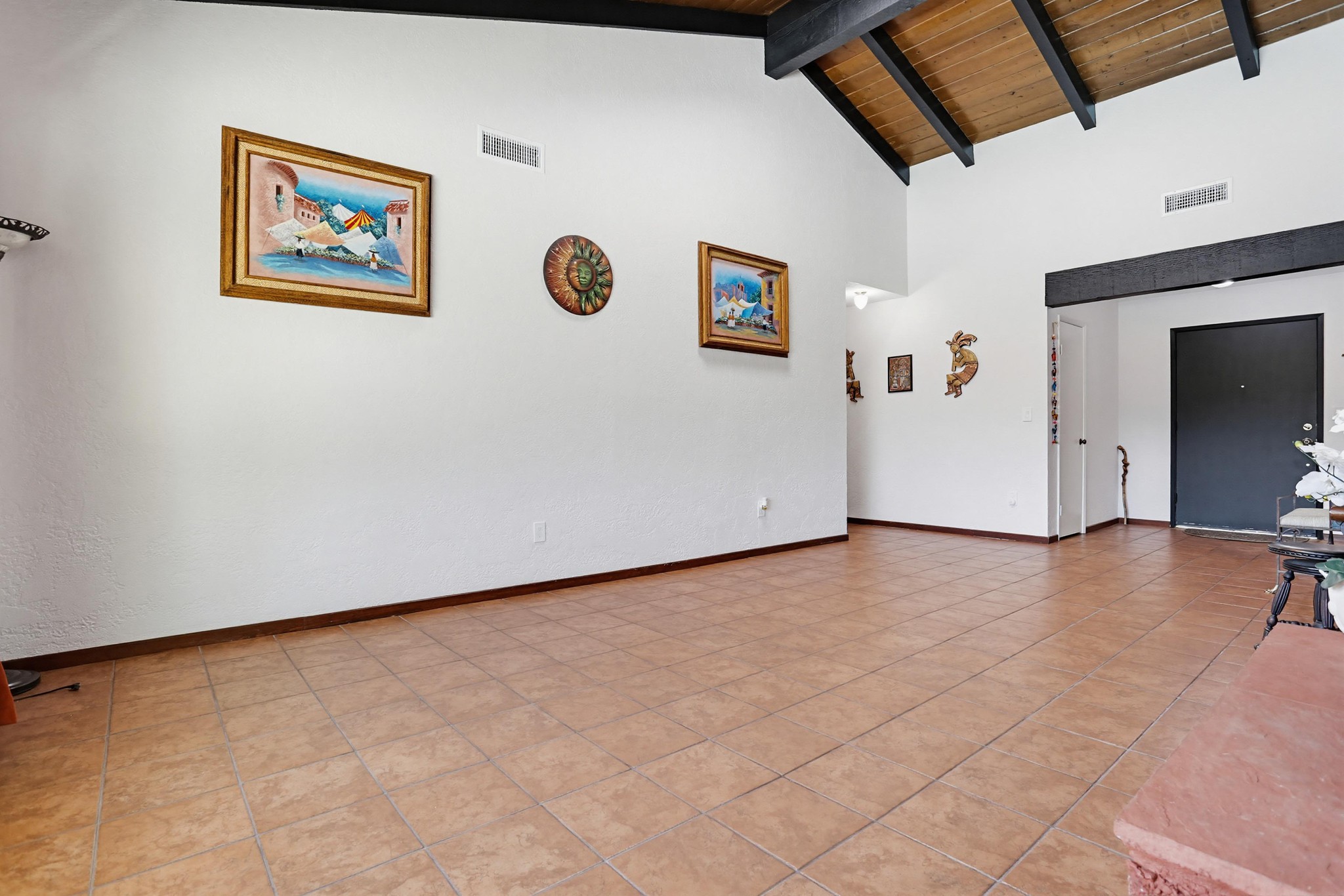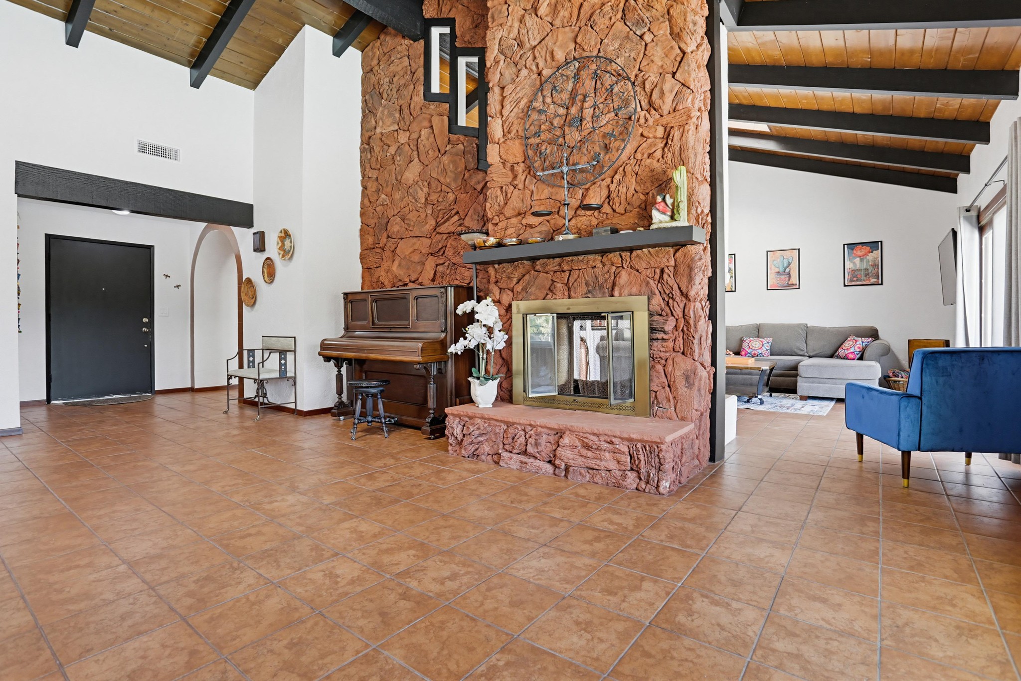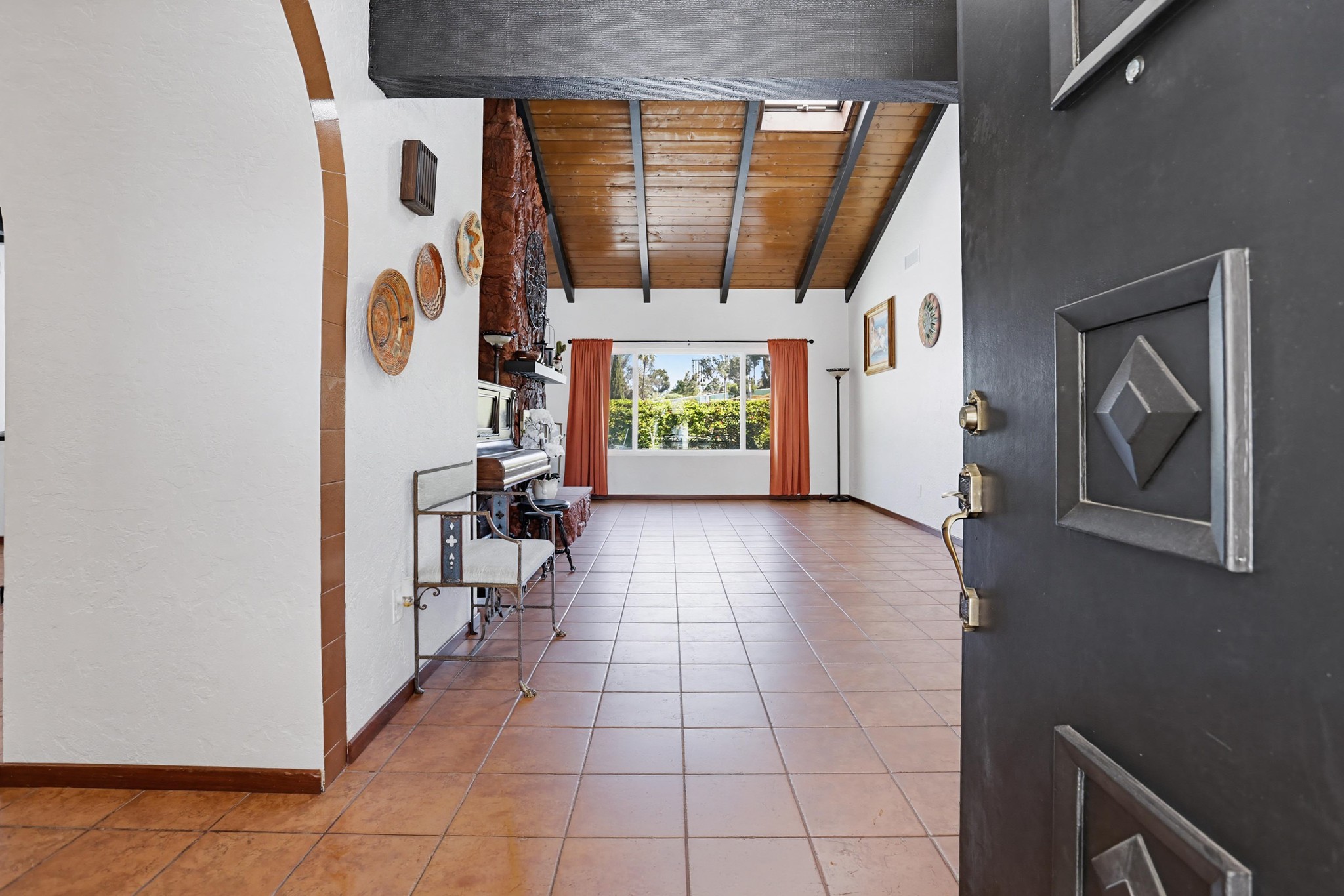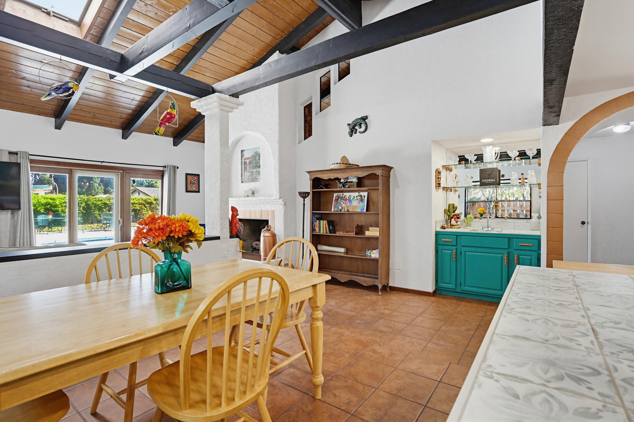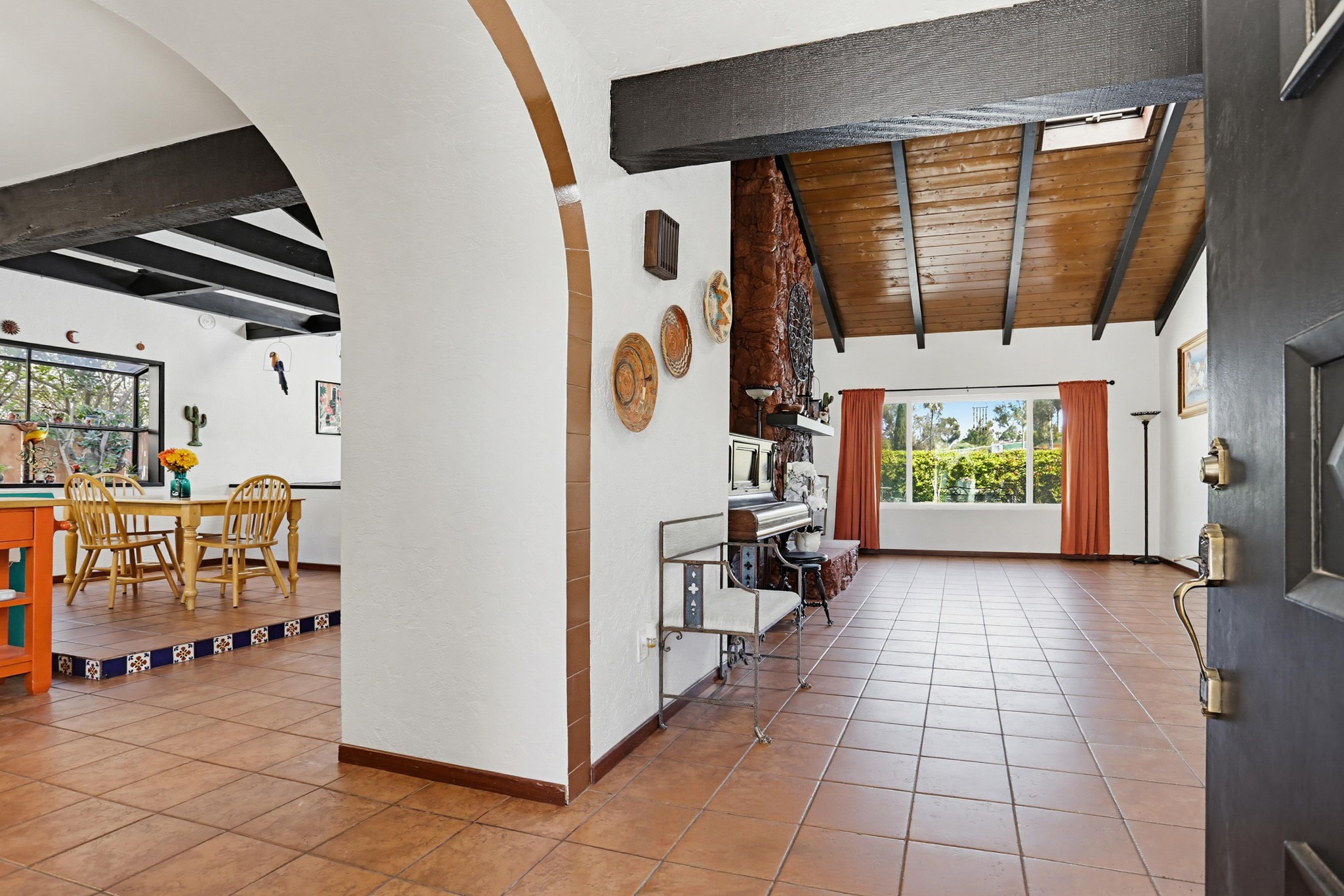 Inside, terracotta-style flooring flows throughout the home, enhancing its warmth and charm. The living room impresses with vaulted wood plank ceilings, exposed beams, skylights, and abundant natural light, all centered around a striking double-sided floor-to-ceiling fireplace that connects the living and family rooms—creating a welcoming and elegant focal point.