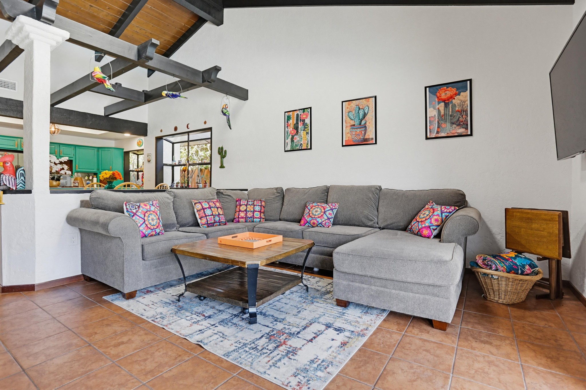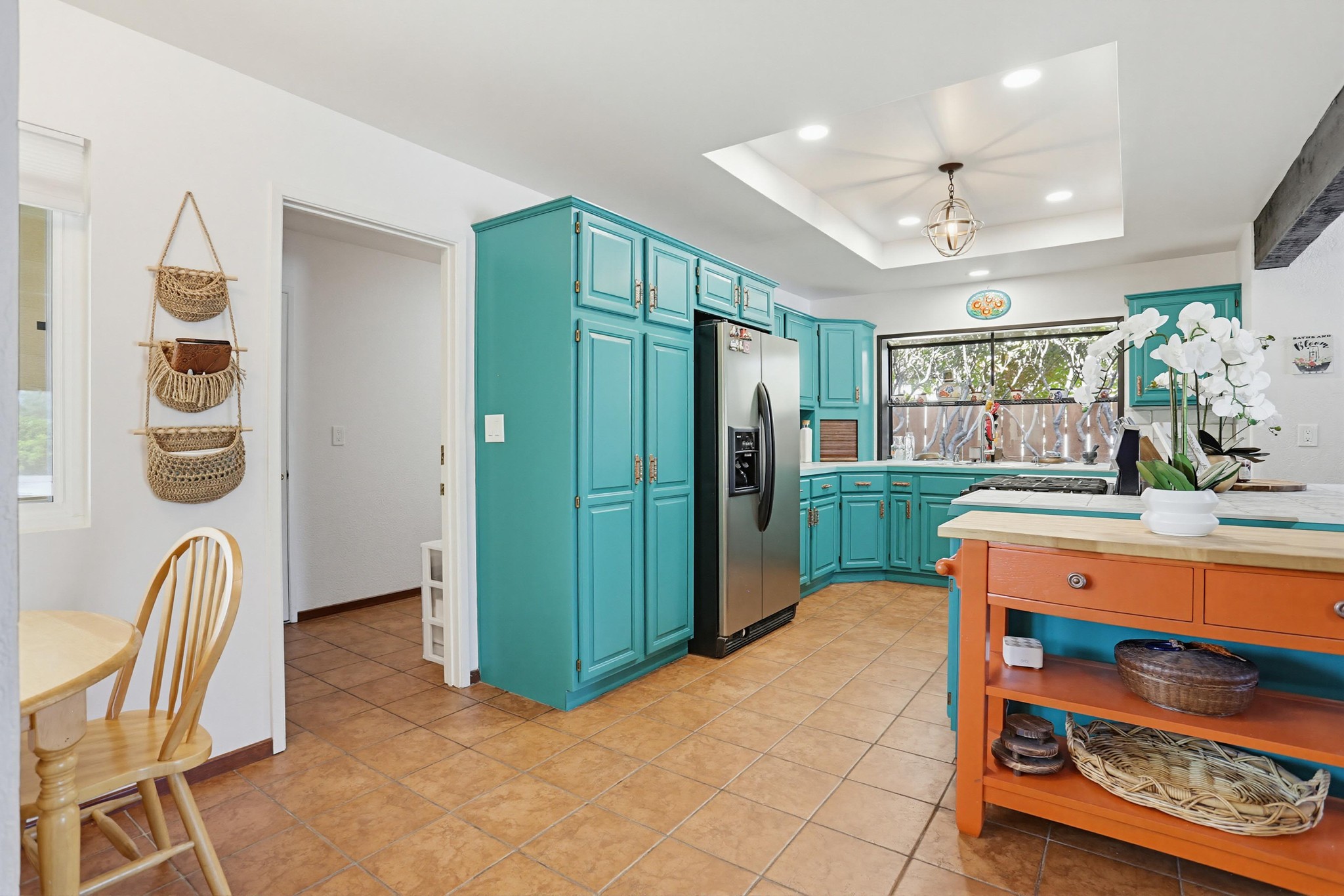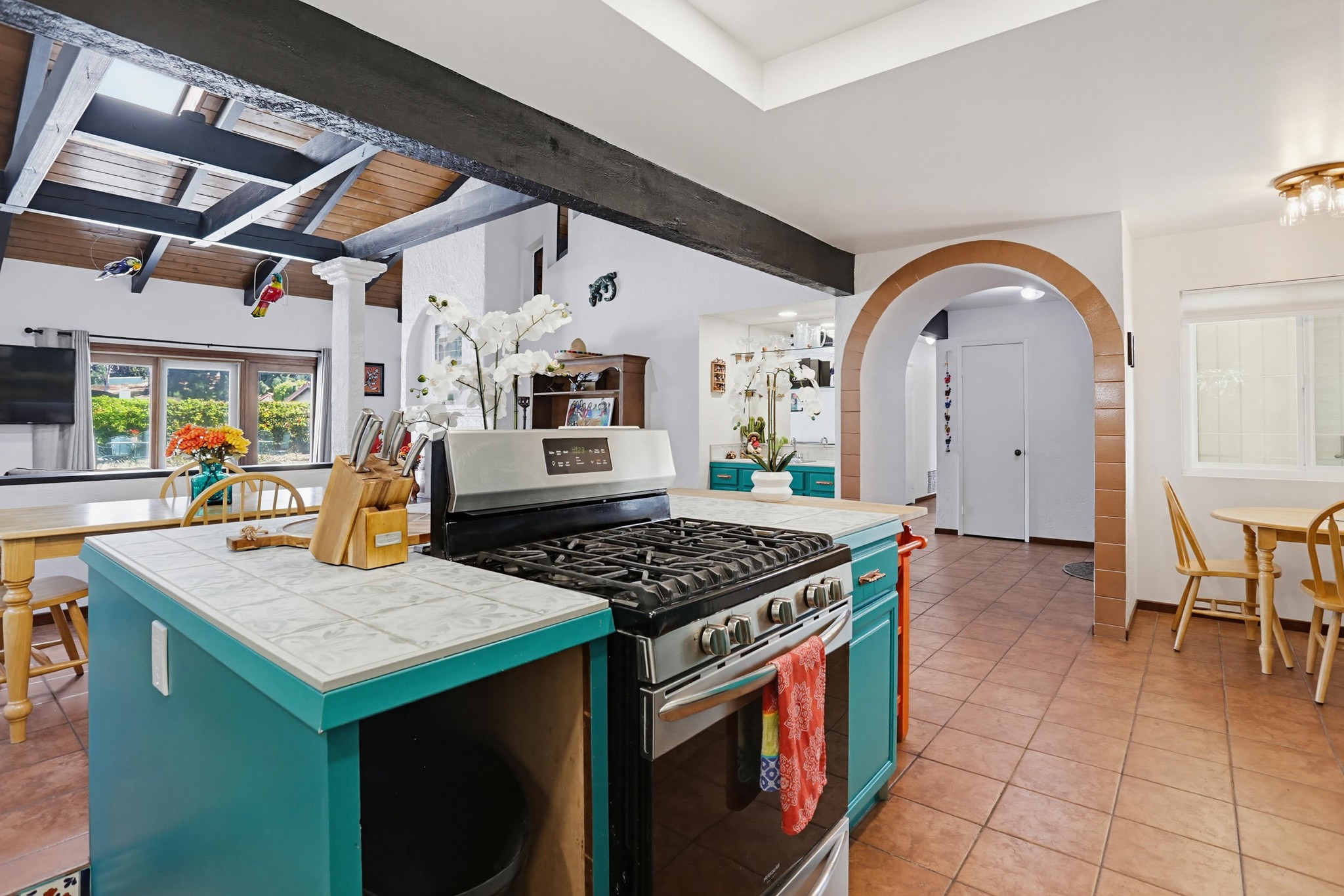 The kitchen is full of personality, featuring vibrant cabinetry, tile countertops, and a functional island, while opening seamlessly to both the main living area and dining room—perfect for entertaining and everyday living. A separate kitchenette provides added flexibility and convenience.