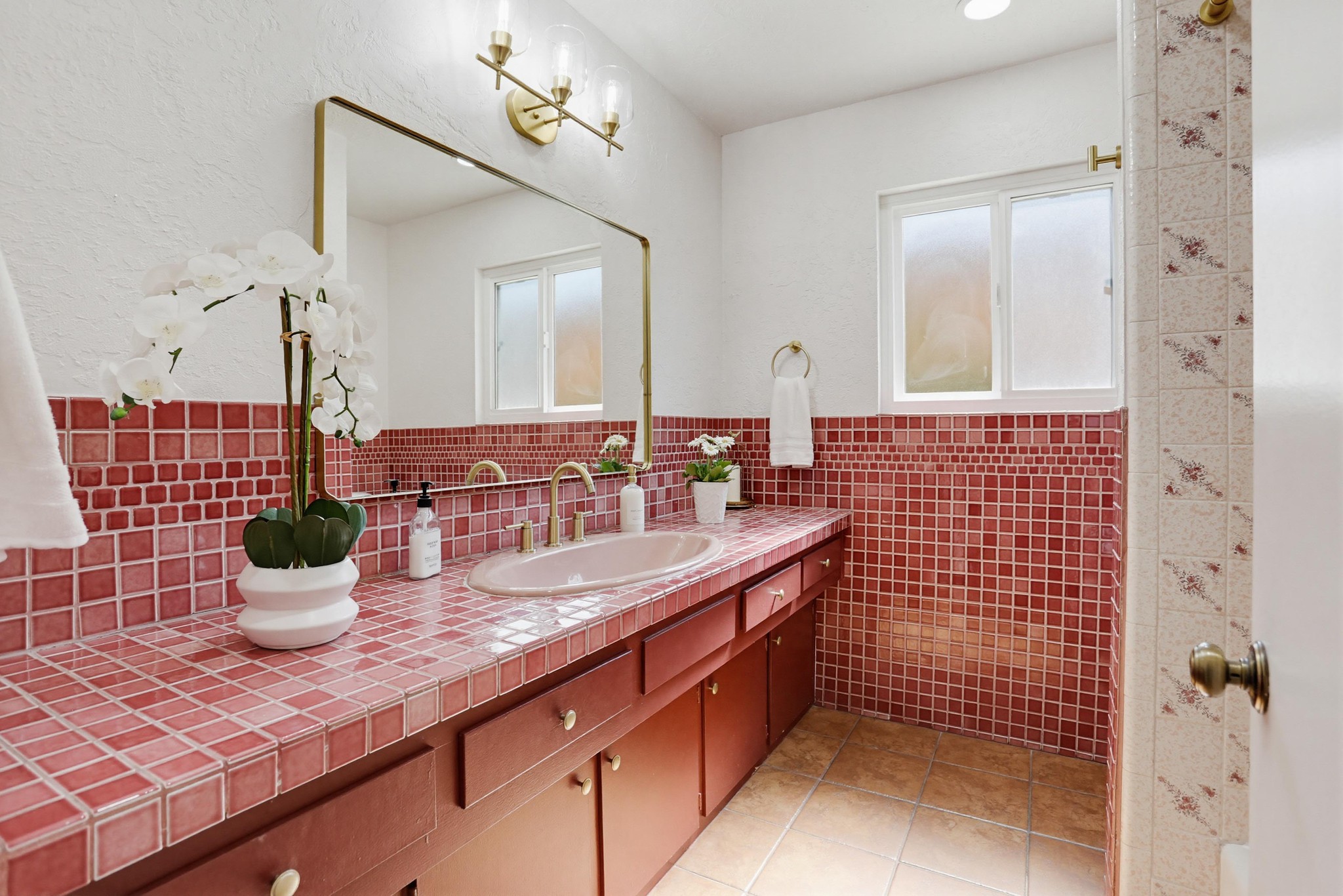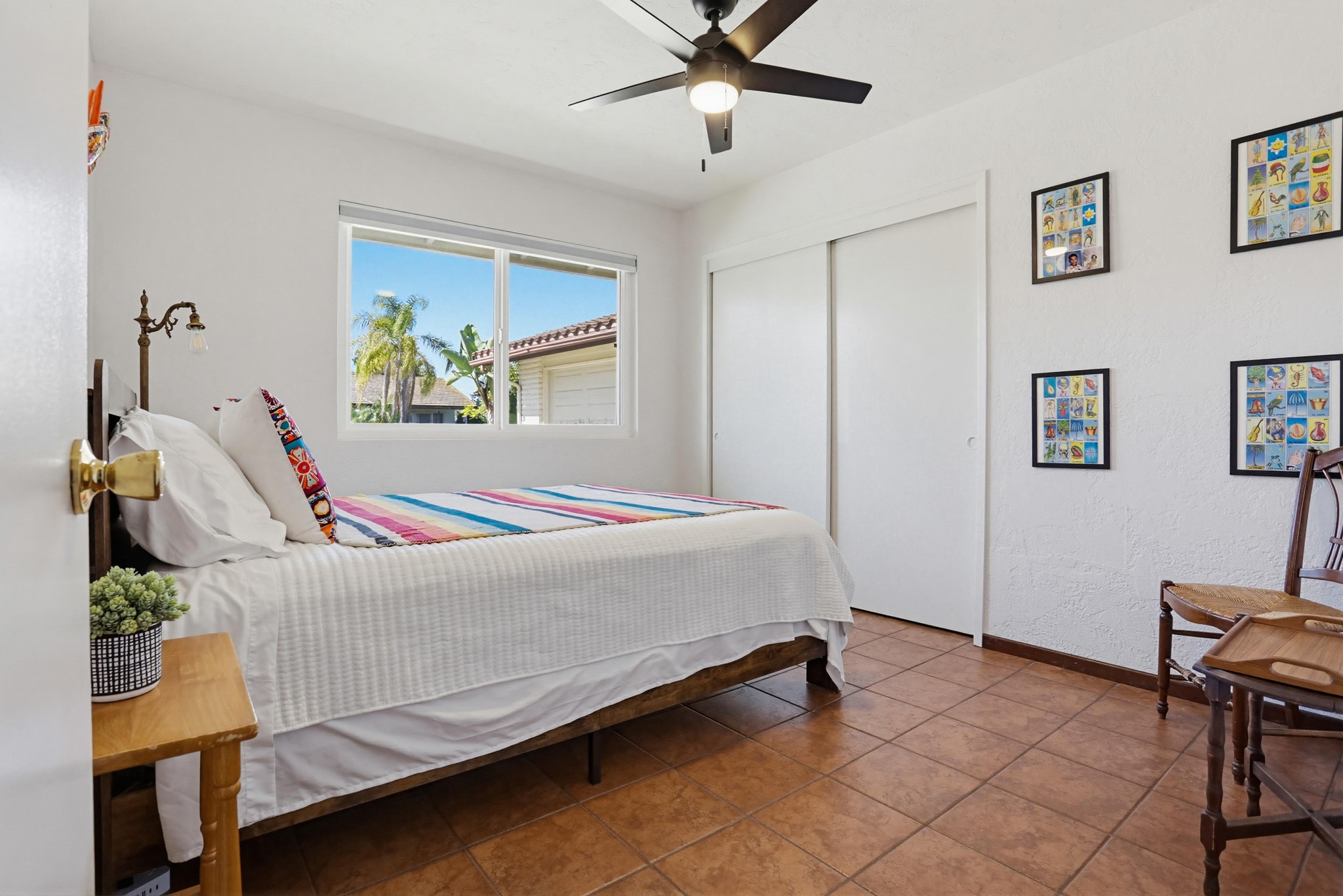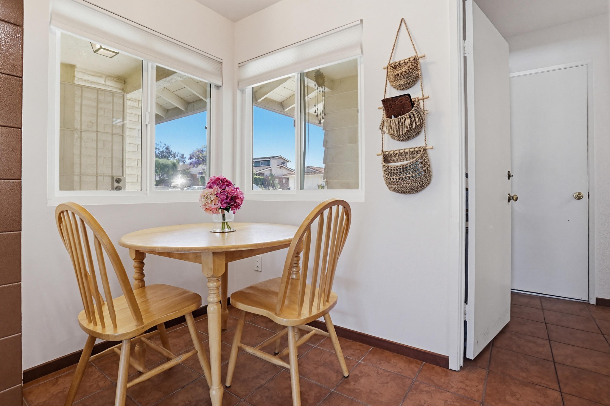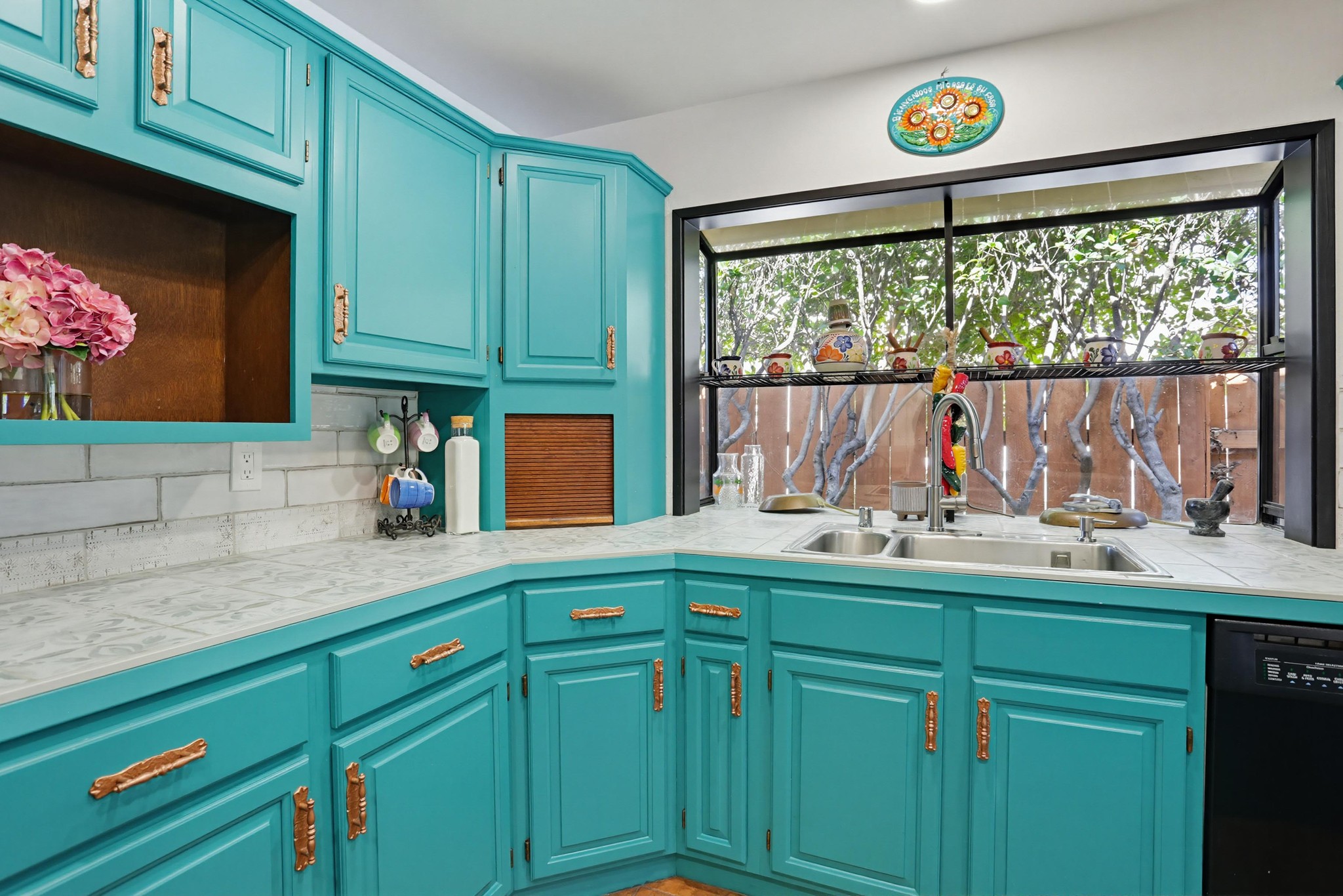 The kitchen is full of personality, featuring vibrant cabinetry, tile countertops, and a functional island, while opening seamlessly to both the main living area and dining room—perfect for entertaining and everyday living. A separate kitchenette provides added flexibility and convenience.