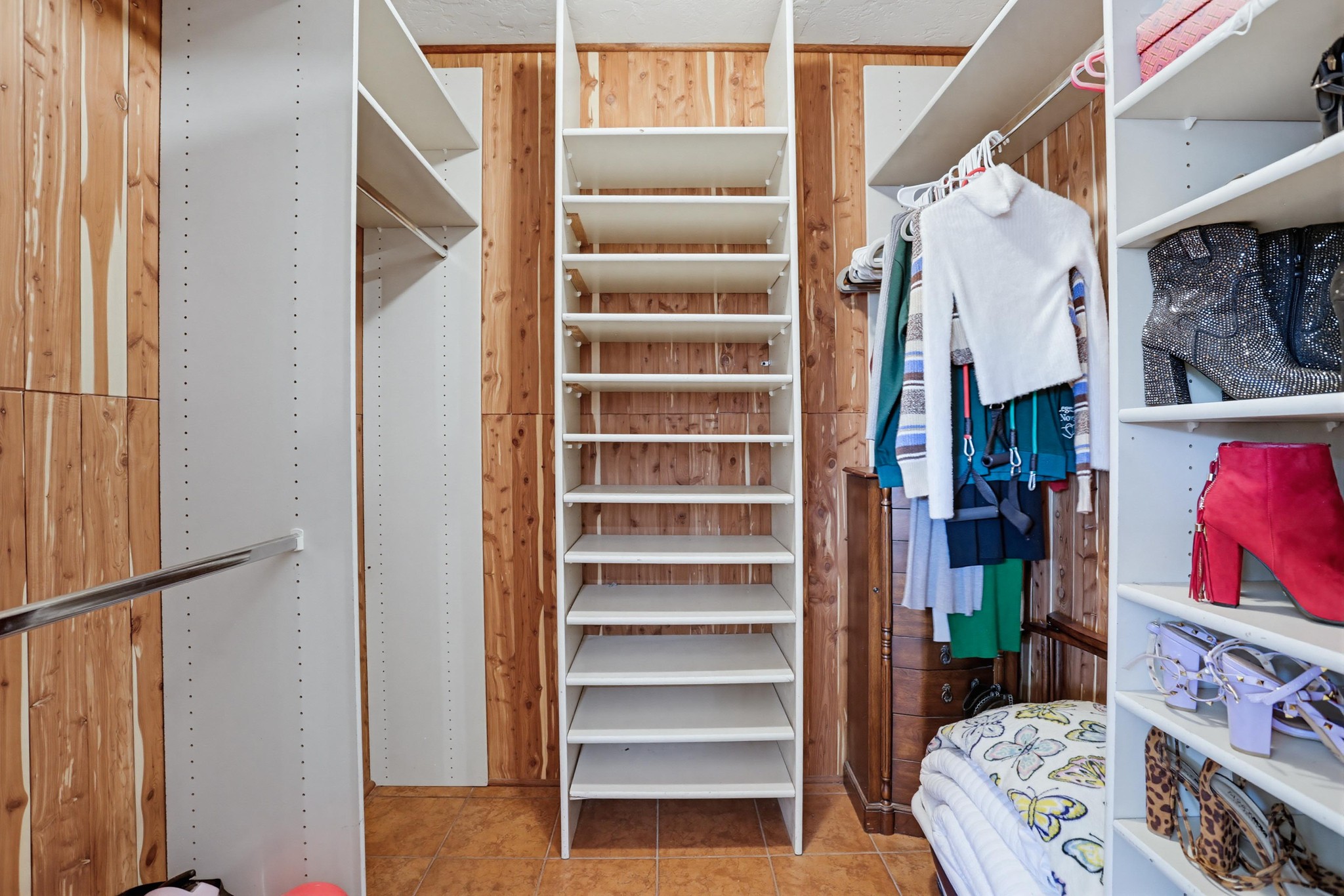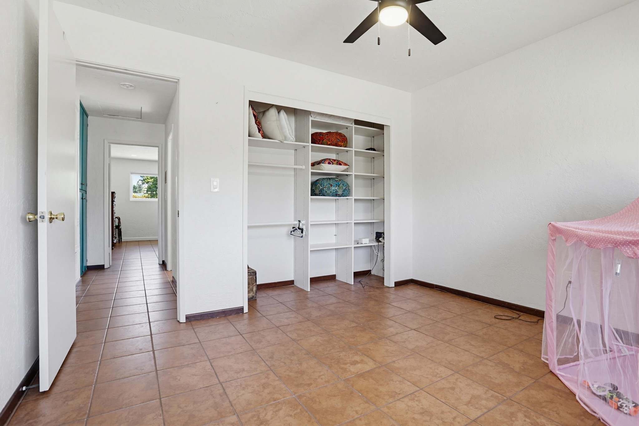 The primary suite offers a private retreat with a dedicated dressing area, walk-in closet, and an en-suite bath showcasing custom tilework and a walk-in shower. Secondary bedrooms are well-sized, offering natural light and versatility.