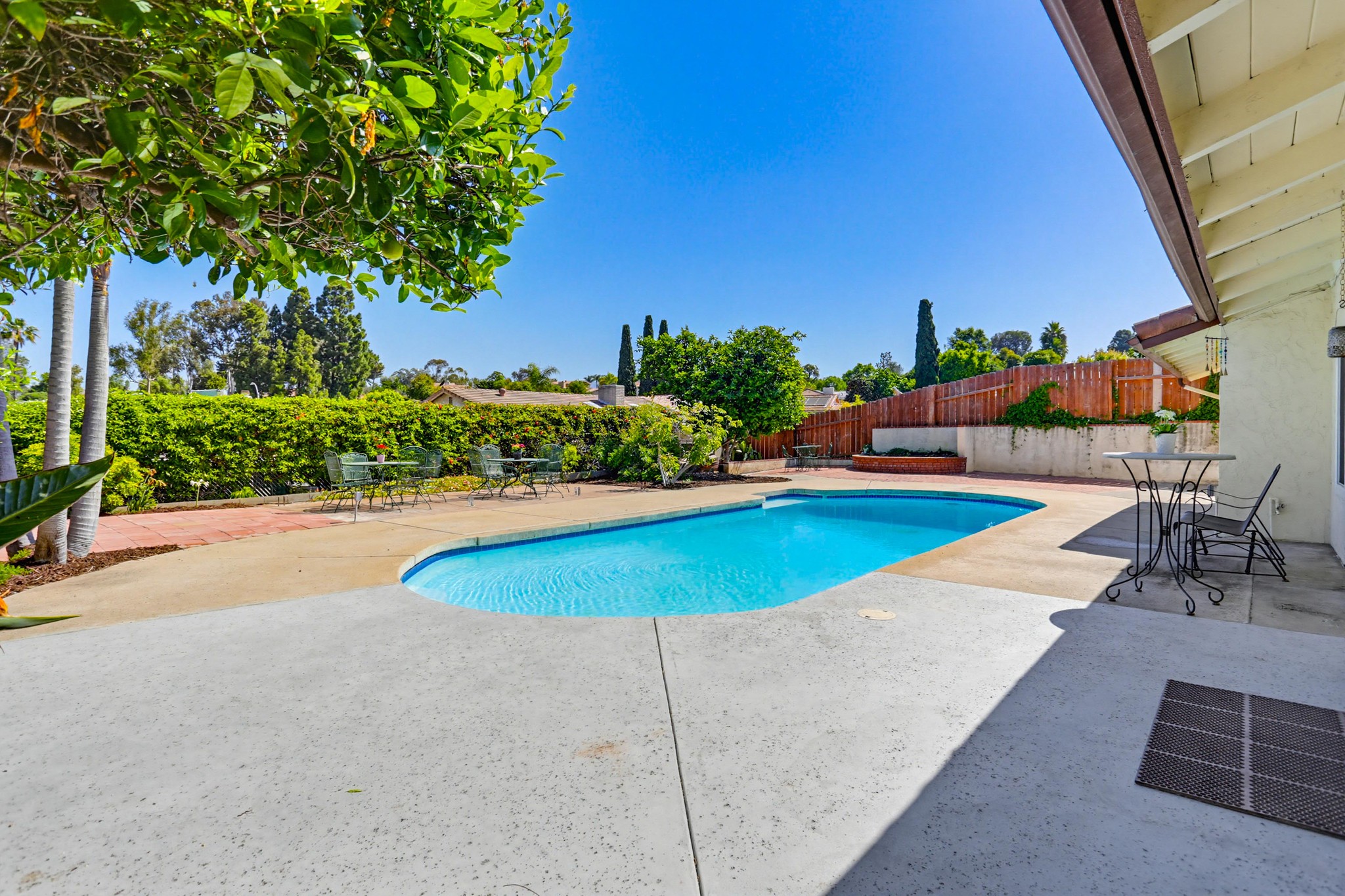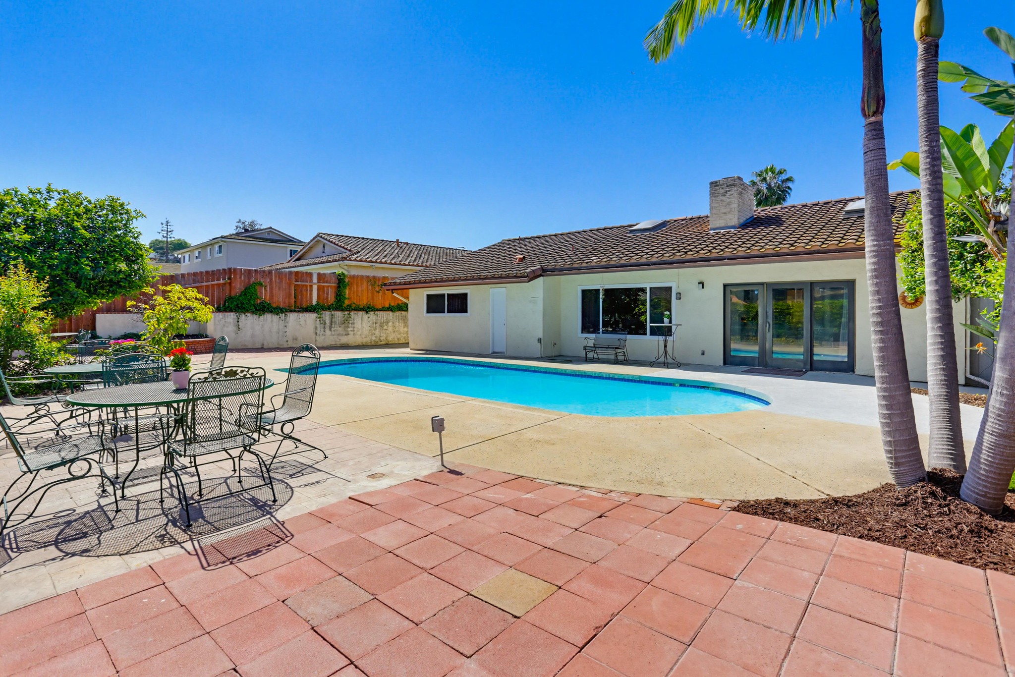 Step outside to a serene backyard retreat featuring an in-ground pool, spacious patio, and mature landscaping with a variety of fruit trees including guava (pink and yellow), loquat, Hass avocado, key lime, peach, passion fruit, fig, and pomegranate—ideal for relaxing or entertaining in a private setting. The property also offers dedicated space on the side of the home for RV or boat parking. Ideally situated near top-rated schools, popular restaurants, and nearby golf courses, this home offers the perfect blend of lifestyle, convenience, and charm.
