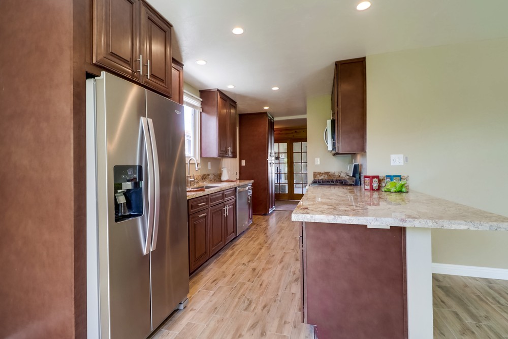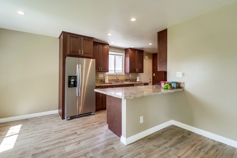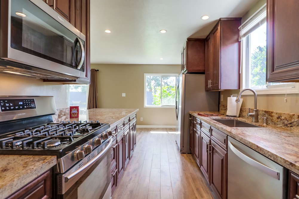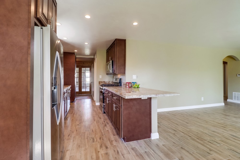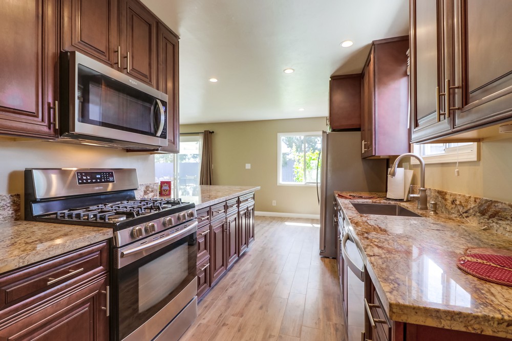 Fabulous single level home is gorgeously remodeled & upgraded! Magnificent eat-in kitchen features beautiful wood cabinets, S.S appliances, granite counter tops & gas range, & opens up to the lovely family room. Spacious living room boasts gorgeous stone fireplace w/elegant mantel, French doors & large picture window. Both bathrooms are stunningly remodeled. This home also features newer dual pane windows, AC, indoor laundry, & huge yard w/ covered patio!