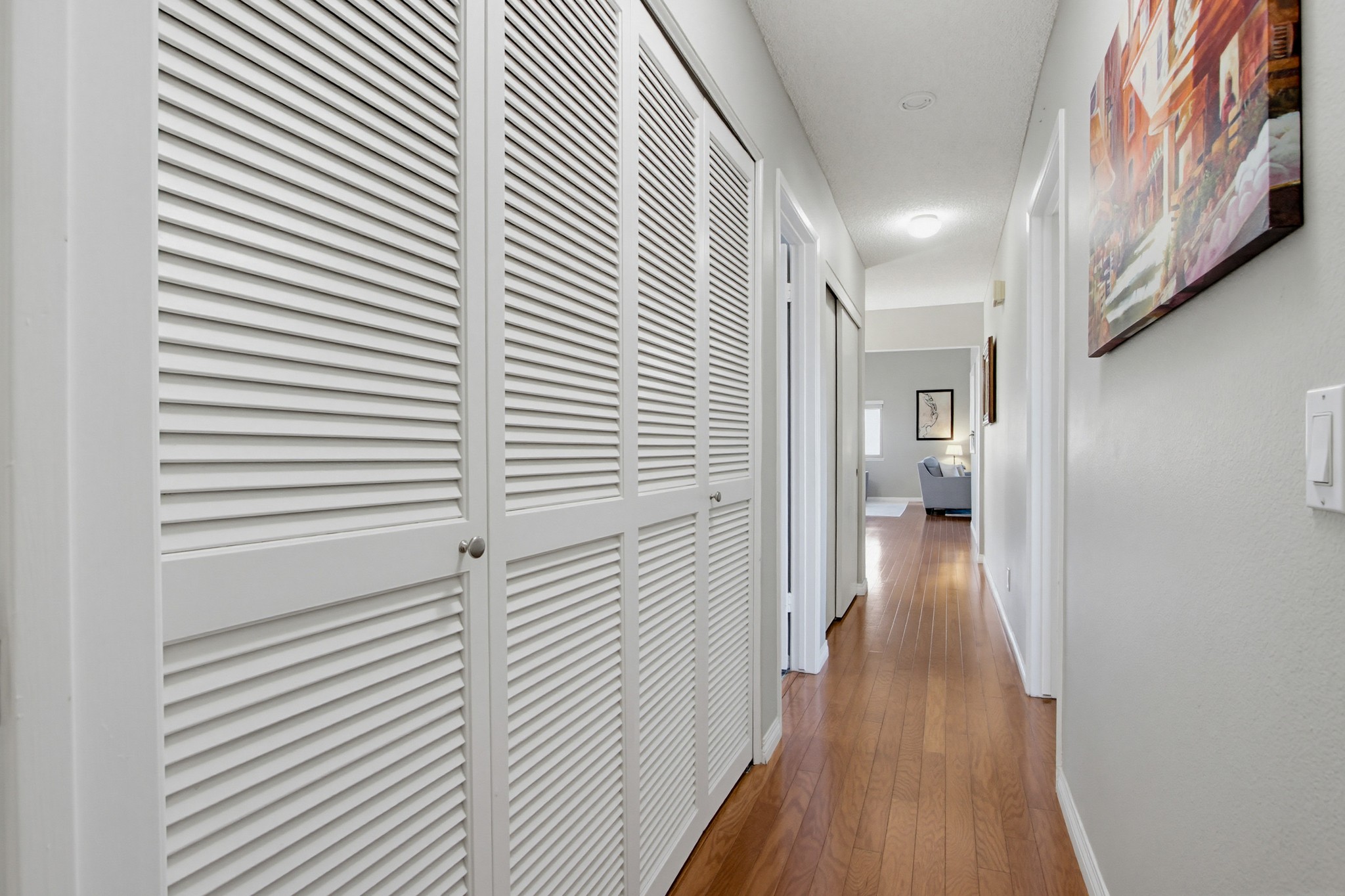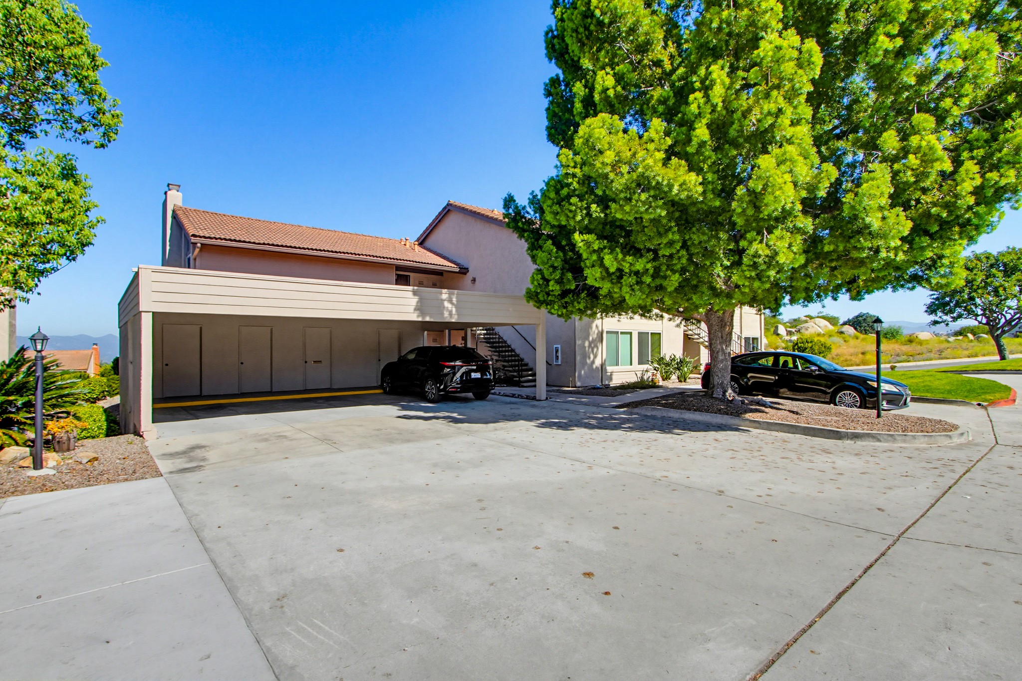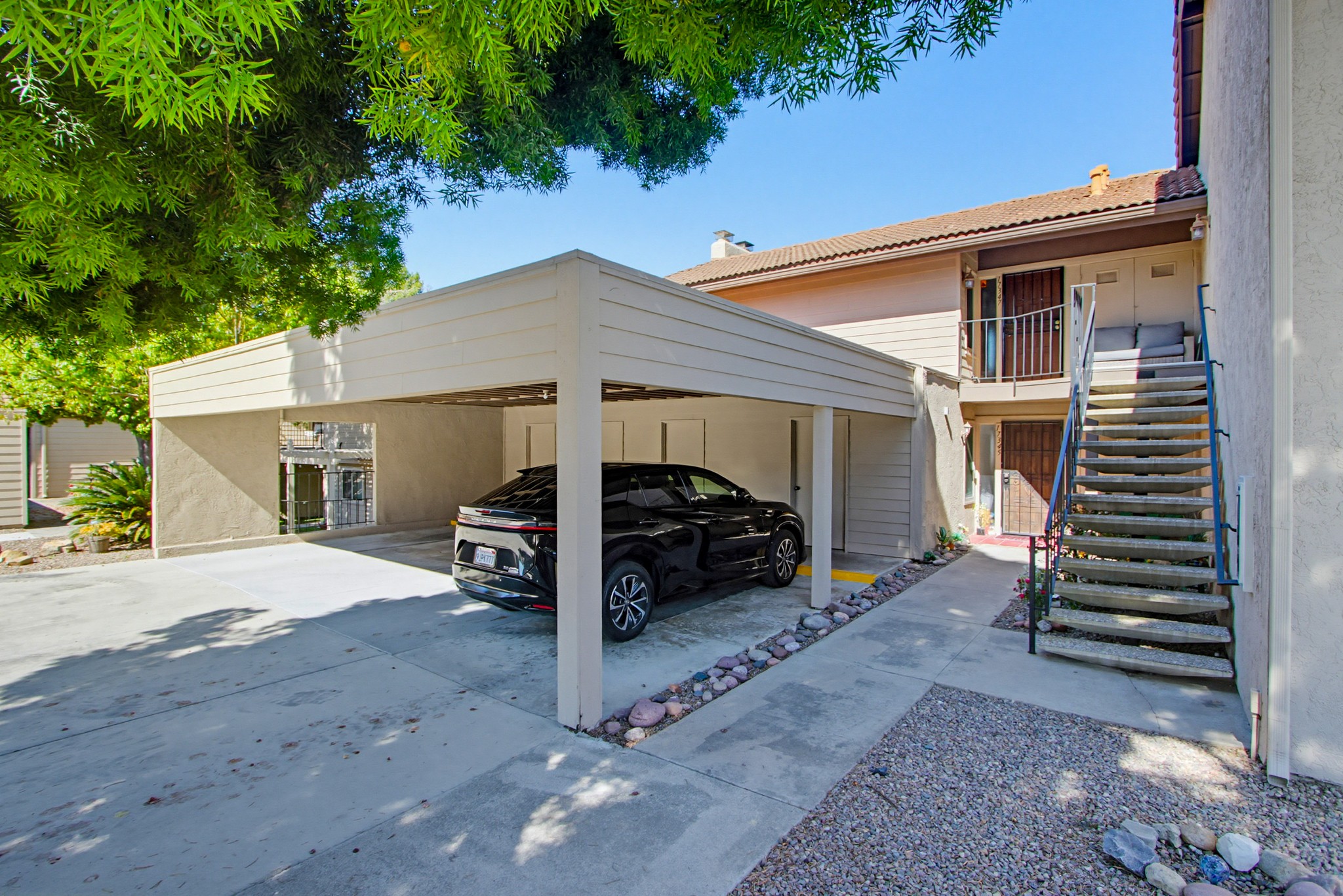 Additional highlights include dual-pane windows, central heating and air conditioning, a side-by-side washer/dryer closet with shelving, a dedicated carport space with storage, and convenient guest parking nearby.