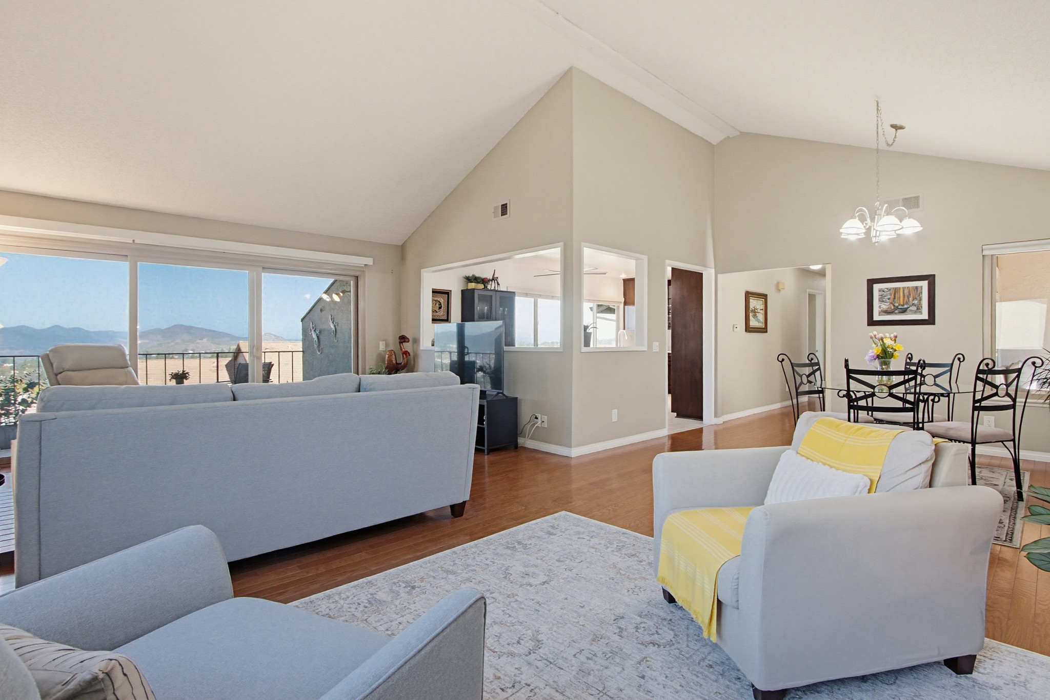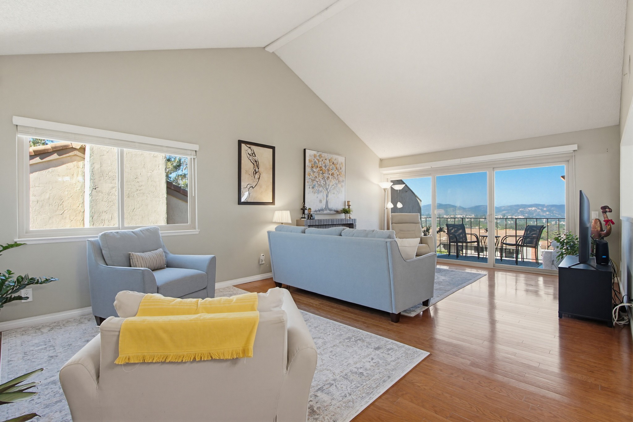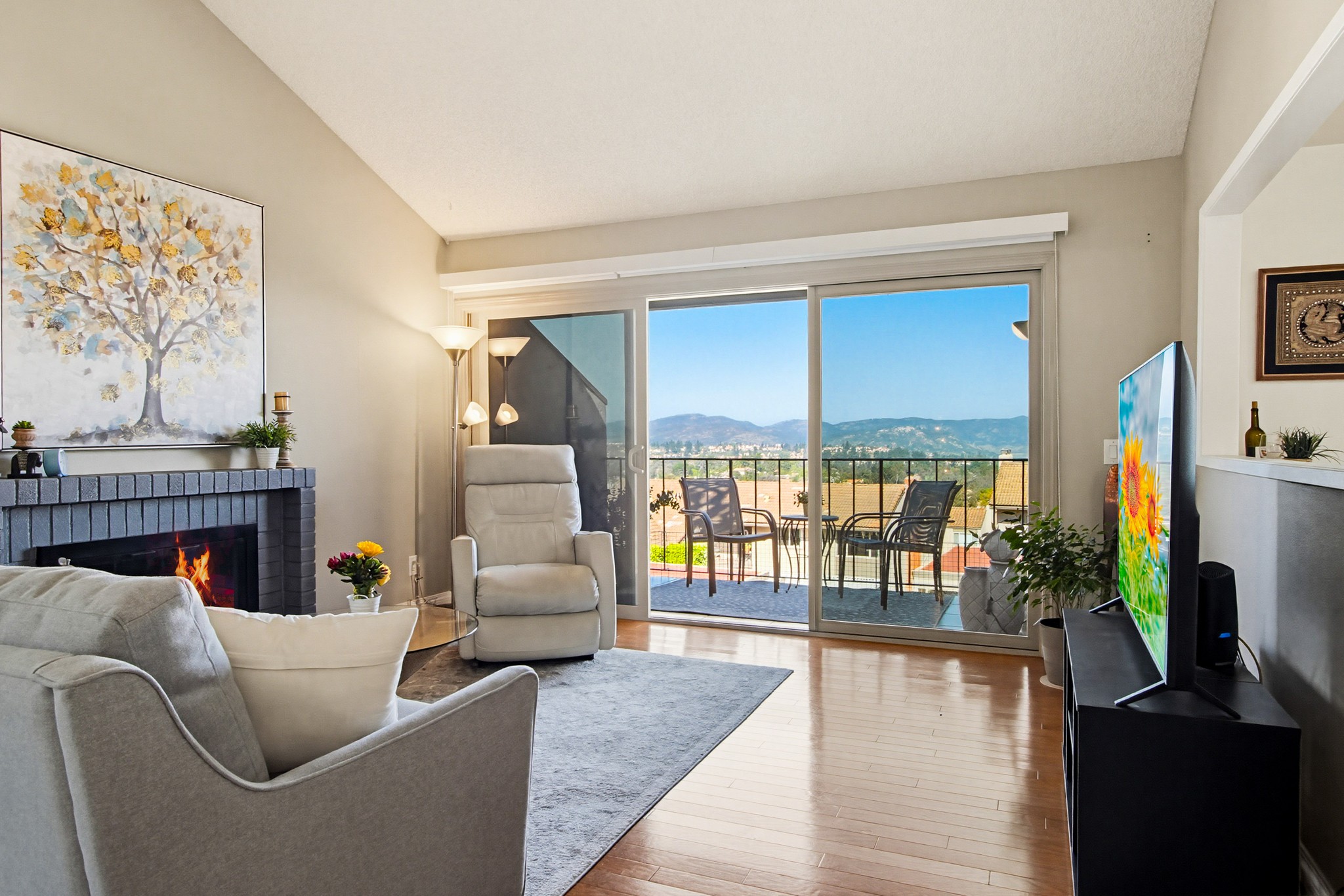 Inside, the open-concept floor plan is filled with natural light and enhanced by vaulted ceilings and hardwood flooring throughout the main living areas. The spacious living room features a cozy fireplace and sliding glass doors that open to a private balcony—perfect for taking in the surrounding scenery.