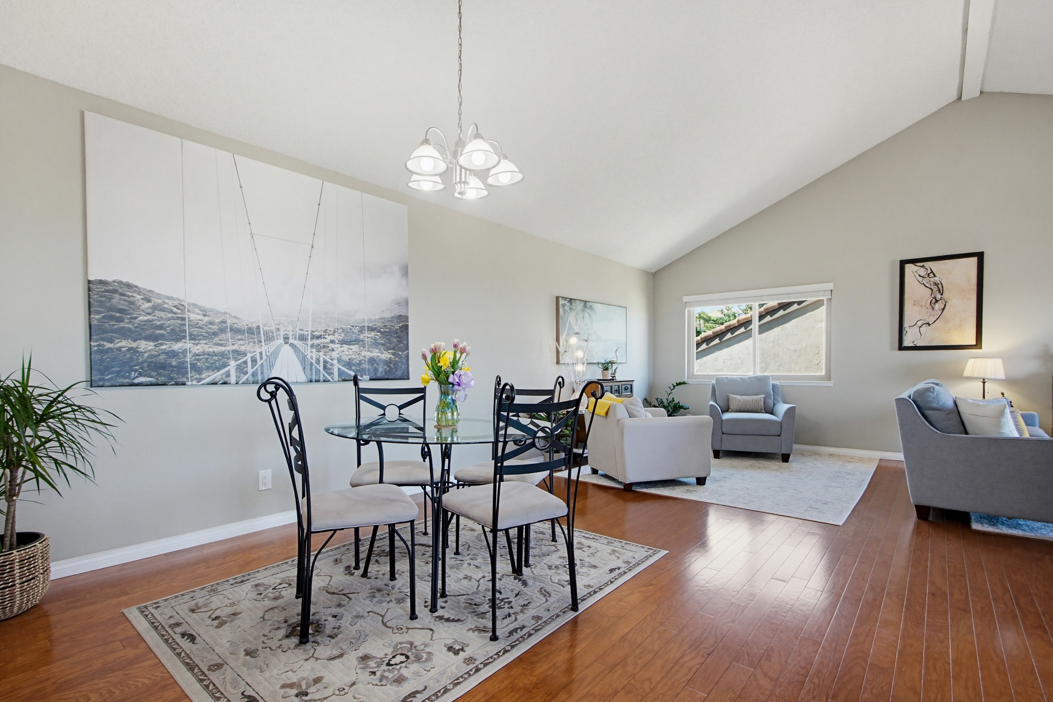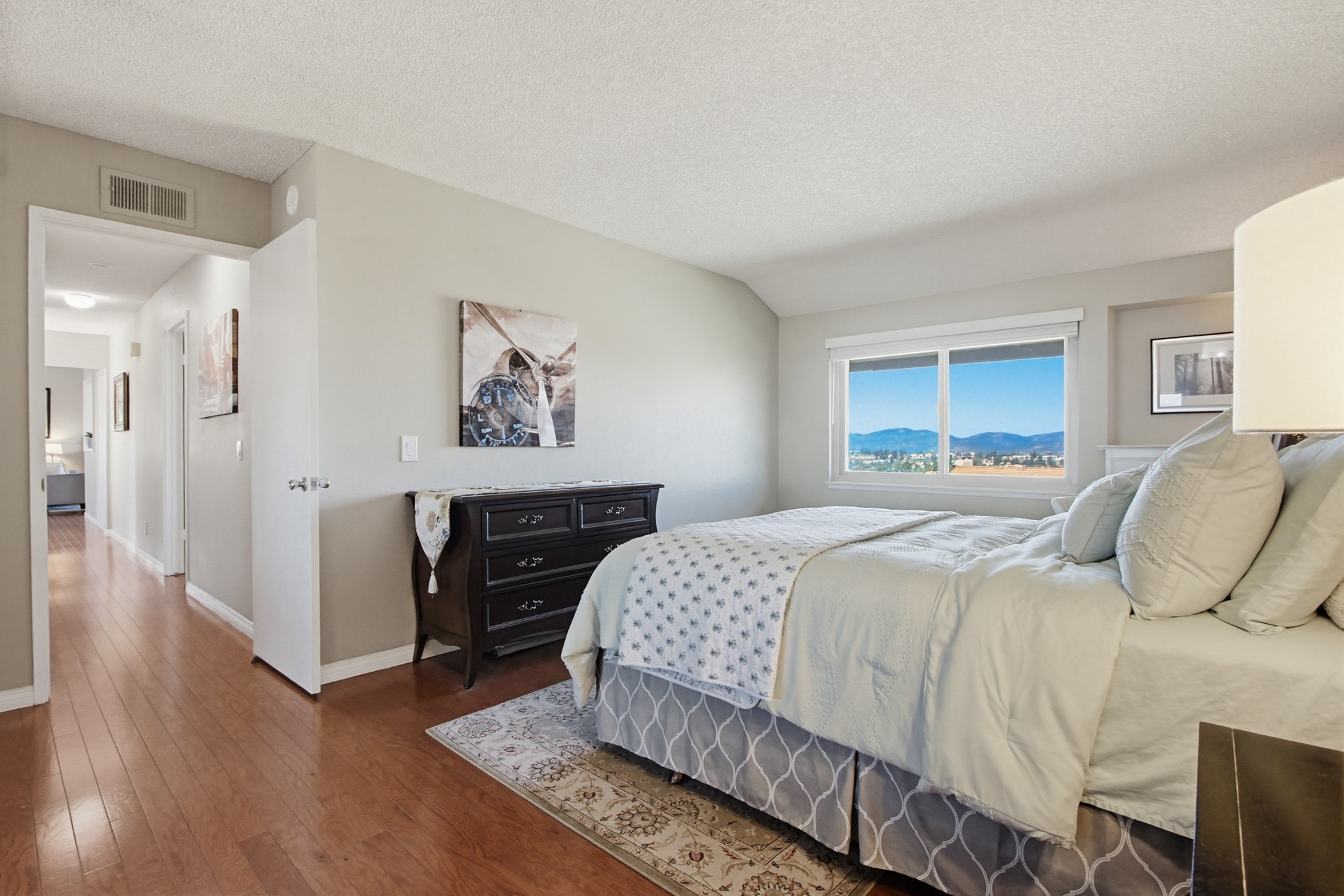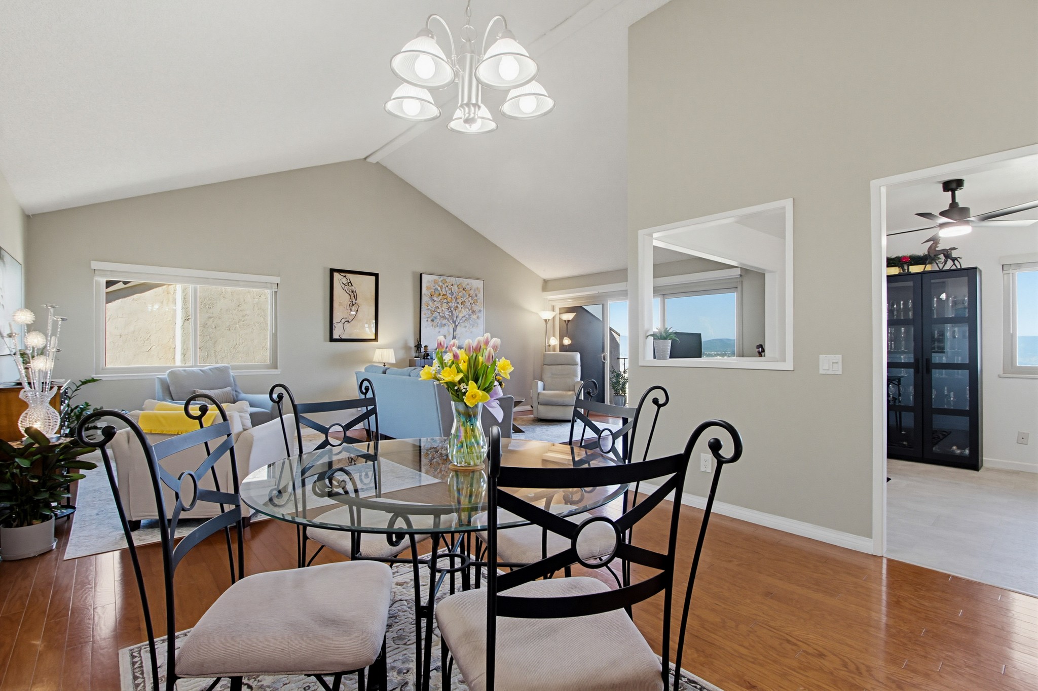 Inside, the open-concept floor plan is filled with natural light and enhanced by vaulted ceilings and hardwood flooring throughout the main living areas. The spacious living room features a cozy fireplace and sliding glass doors that open to a private balcony—perfect for taking in the surrounding scenery.