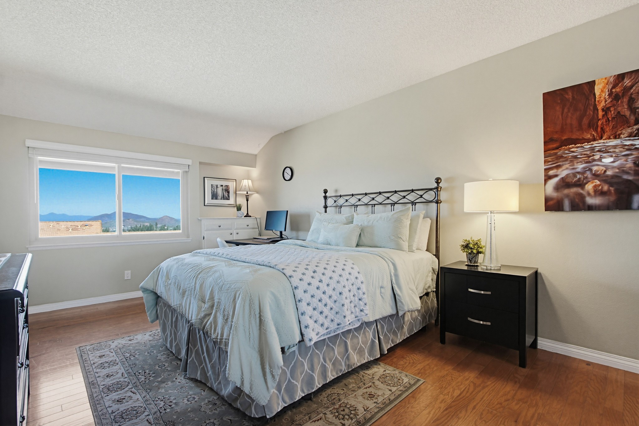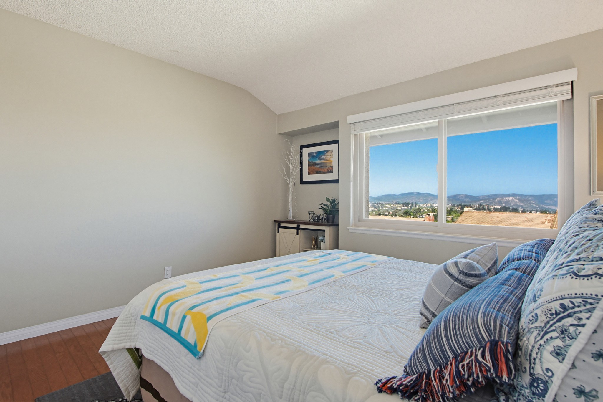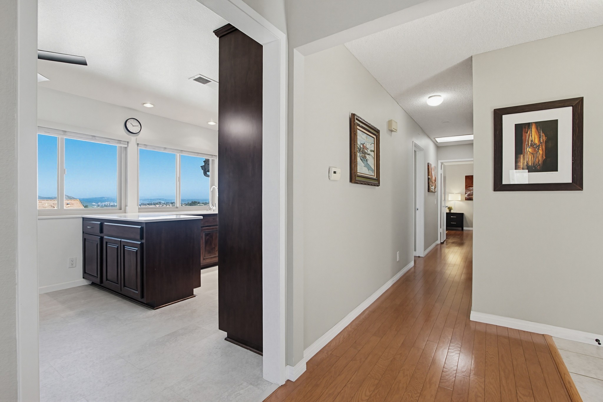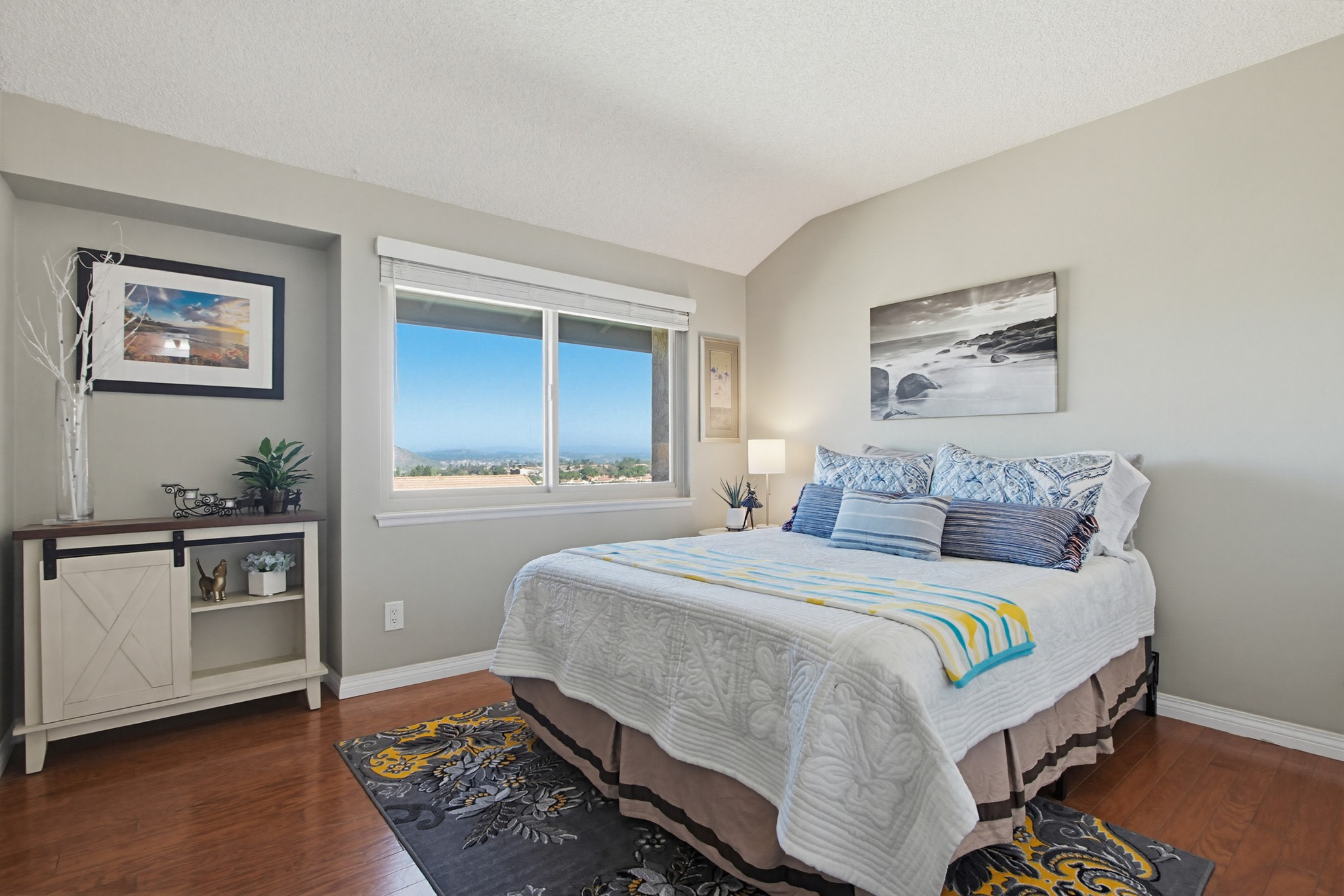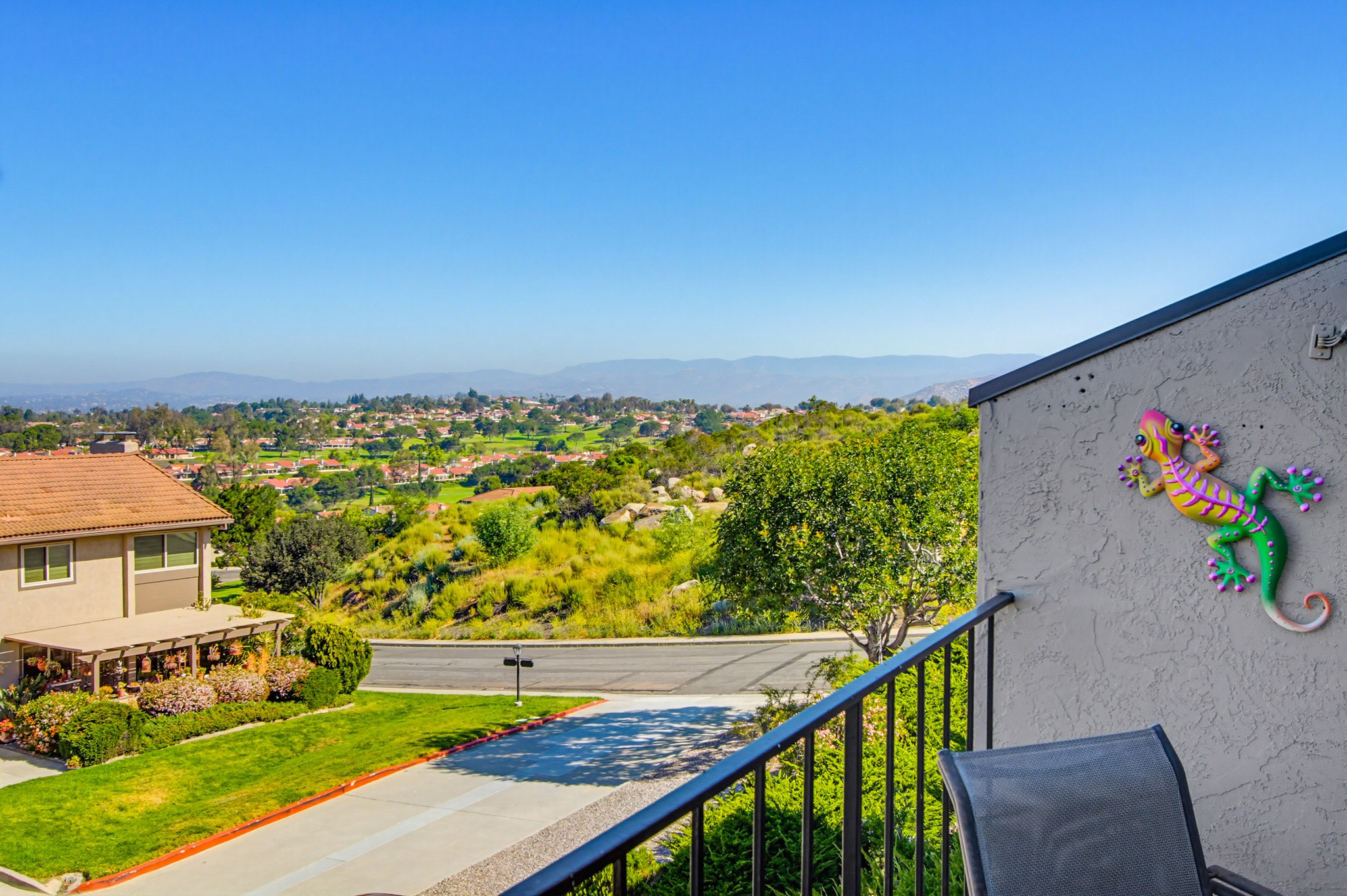 Perched in a prime hilltop location, this immaculate move-in ready home offers breathtaking panoramic views from every room—mountains, evening lights, gorgeous sunsets and the golf course—plus a peek-a-boo glimpse of Lake Hodges.