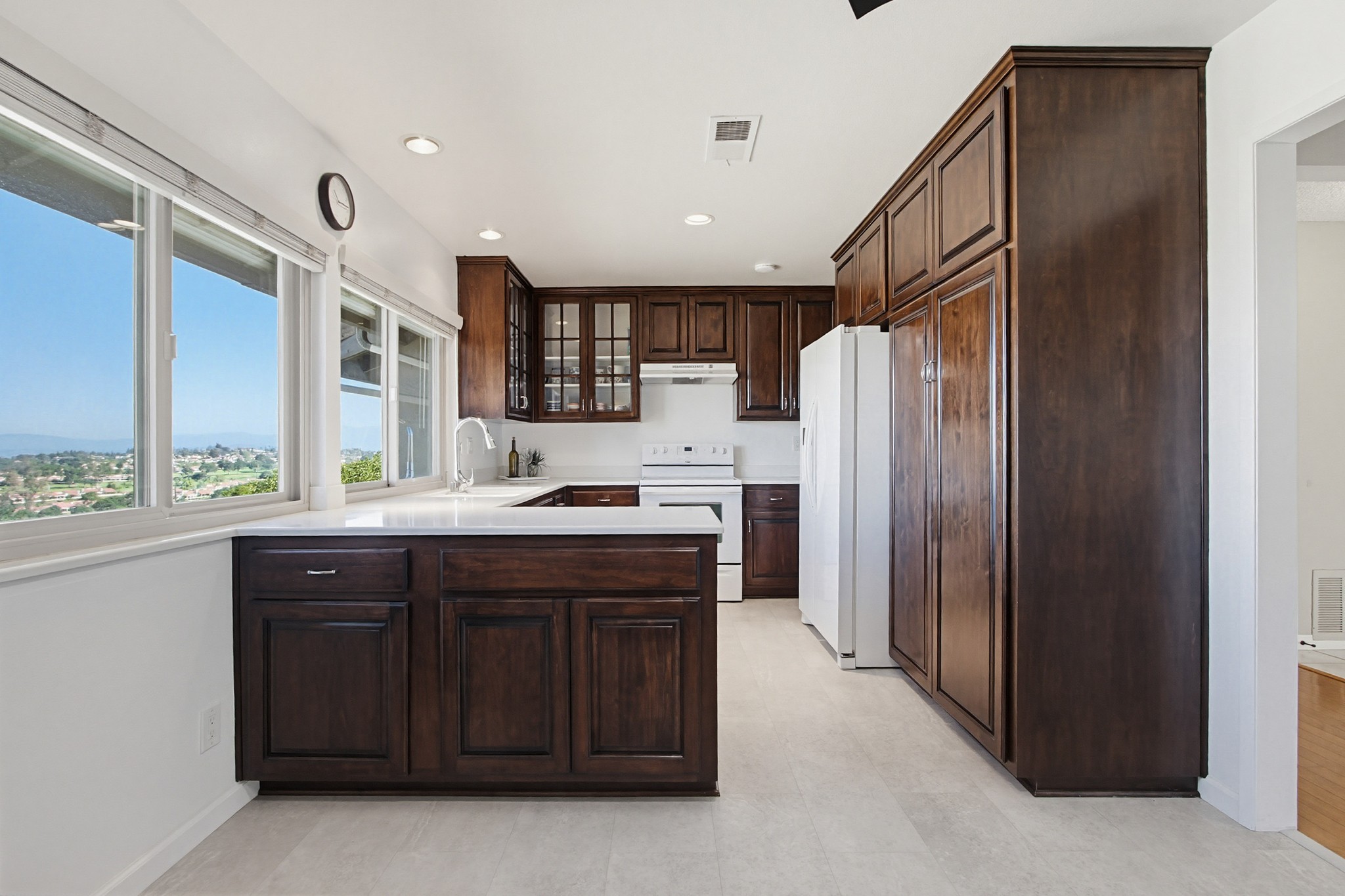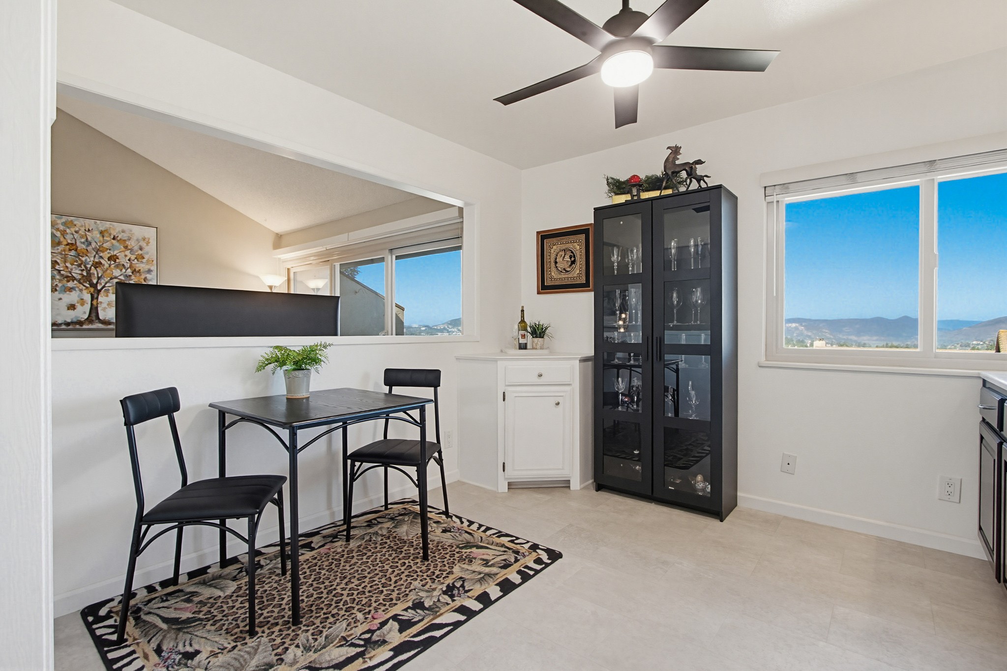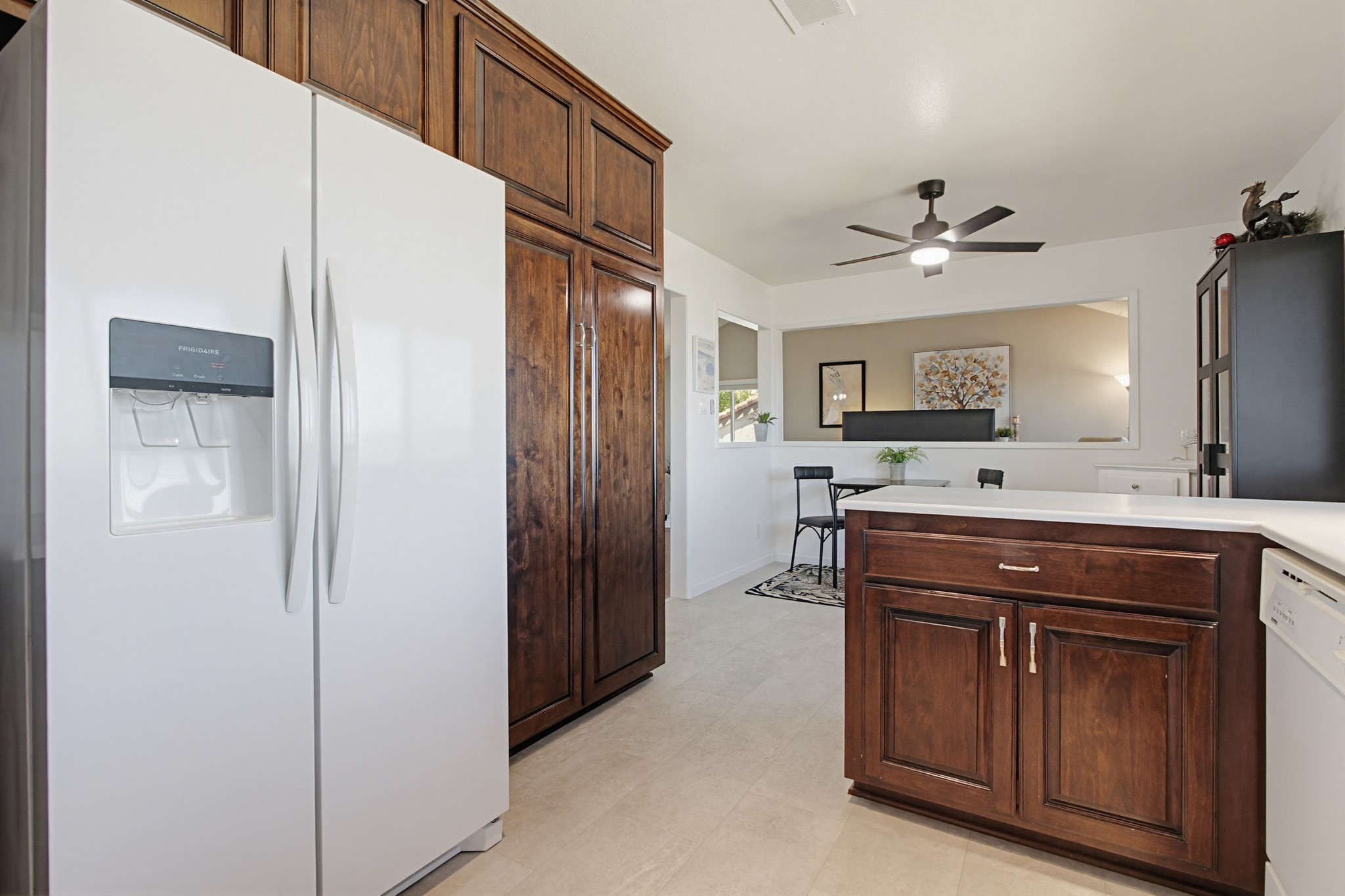 The updated kitchen showcases rich dark brown cabinetry inviting an elegant space both cozy and luxurious, with glass-front accents, brushed nickel hardware, white countertops, recessed lighting, and a charming dining nook with ceiling fan. A full appliance suite includes a refrigerator, dishwasher, and flat ceramic cooktop/oven. Thoughtfully designed, the kitchen offers a sense of separation while remaining open to the dining and living areas—ideal for both everyday living and entertaining.