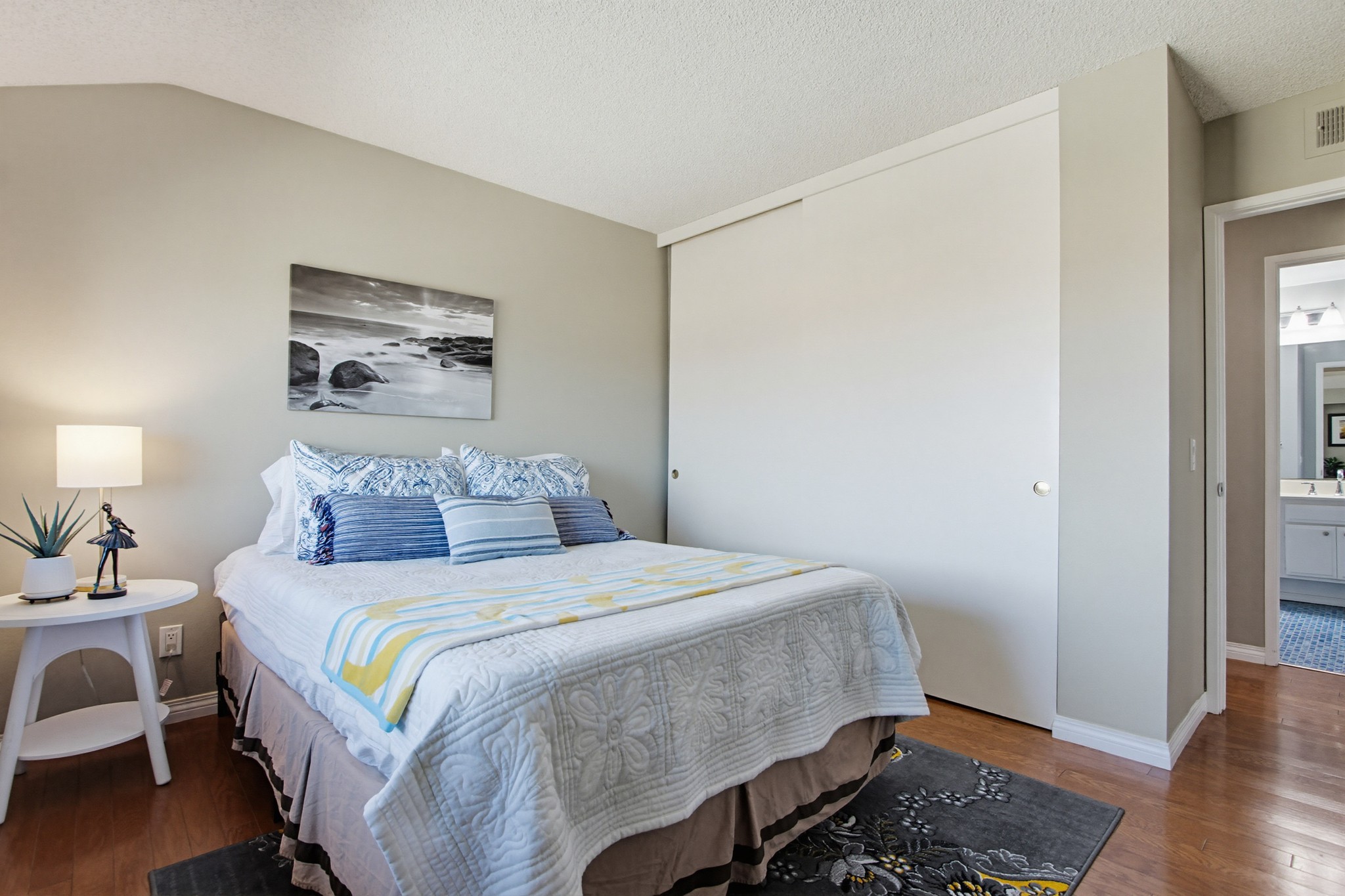 Both bedrooms feature hardwood floors, privacy shades, and scenic views, with the primary bedroom offering mirrored wardrobe doors. The primary bathroom includes generous counter space and a separate enclosed area for the toilet and a beautifully tiled tub/shower combination with matching tile flooring. The secondary bathroom features a walk-in shower with glass doors and stylish blue tile flooring.